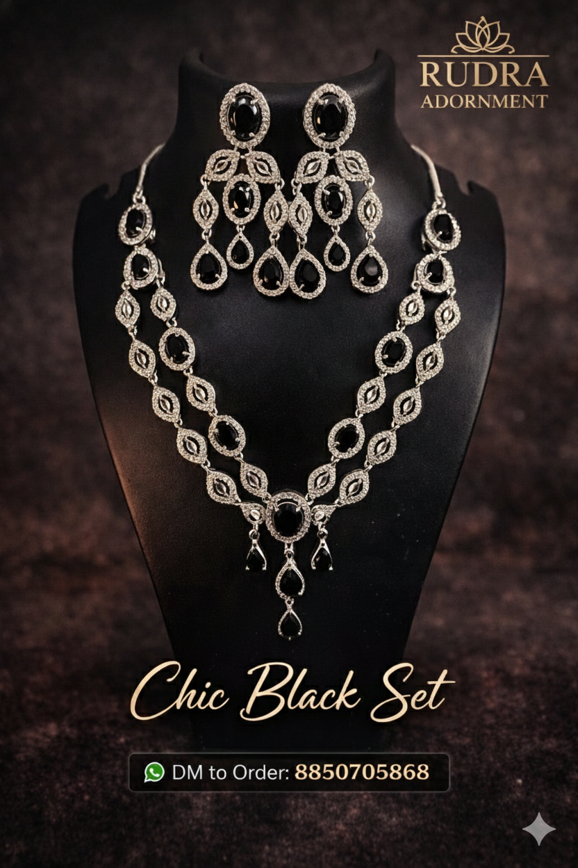 Elevate your evening attire with the Chic Black Set, a masterpiece from the Rudra Adornment collection. This set is meticulously crafted to capture the light and the attention of every room you enter. Whether it’s a black-tie event or a festive celebration, this set provides a polished, high-fashion finish.