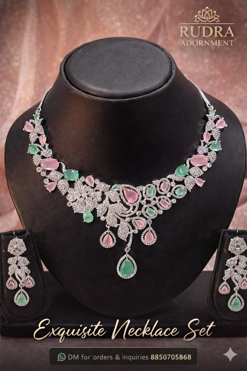 Embrace soft glamour with the Exquisite Necklace Set by Rudra Adornment. This piece features a graceful garden-inspired design adorned with mint green and pastel pink teardrop stones. It’s the perfect accessory for daytime weddings, brunches, or sophisticated evening soirées.